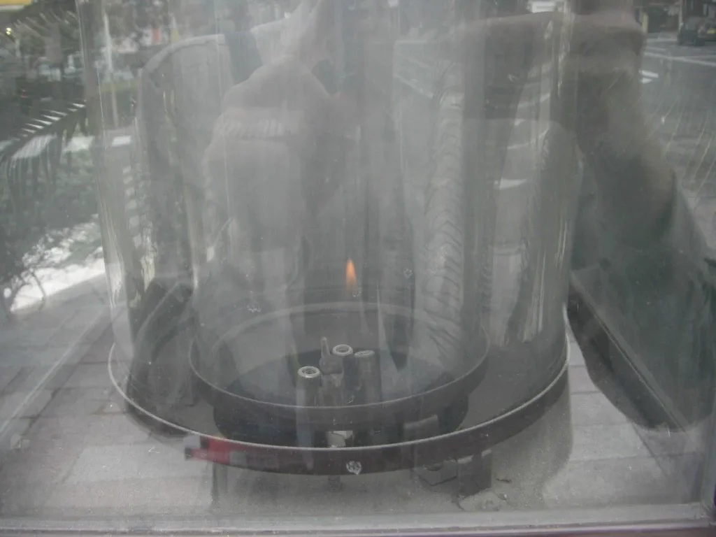 島原市役所前で、平成新山のマグマから取った火が、今も燃え続ける。