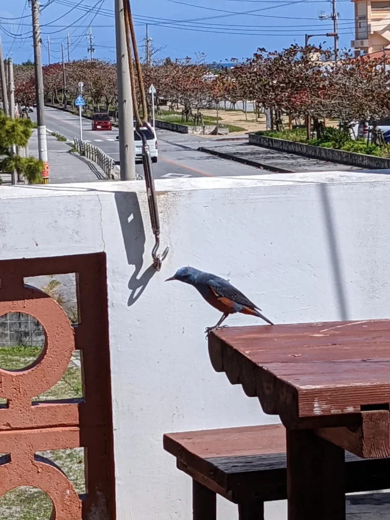 平安座島のBOULANGERIE CAFÉ Yamashitaにて。3月の昼下がり、バルコニーのテーブルでは小鳥が一羽、羽を休めていました。