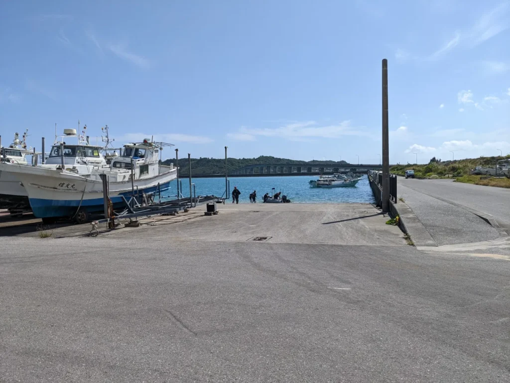 平安座島の中心部に⚓️漁港⚓️があります。遠くに見えるのが浜比嘉大橋です。