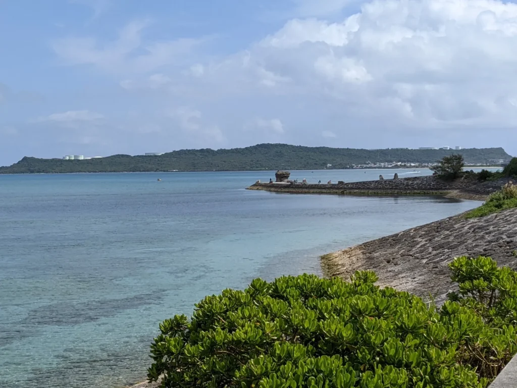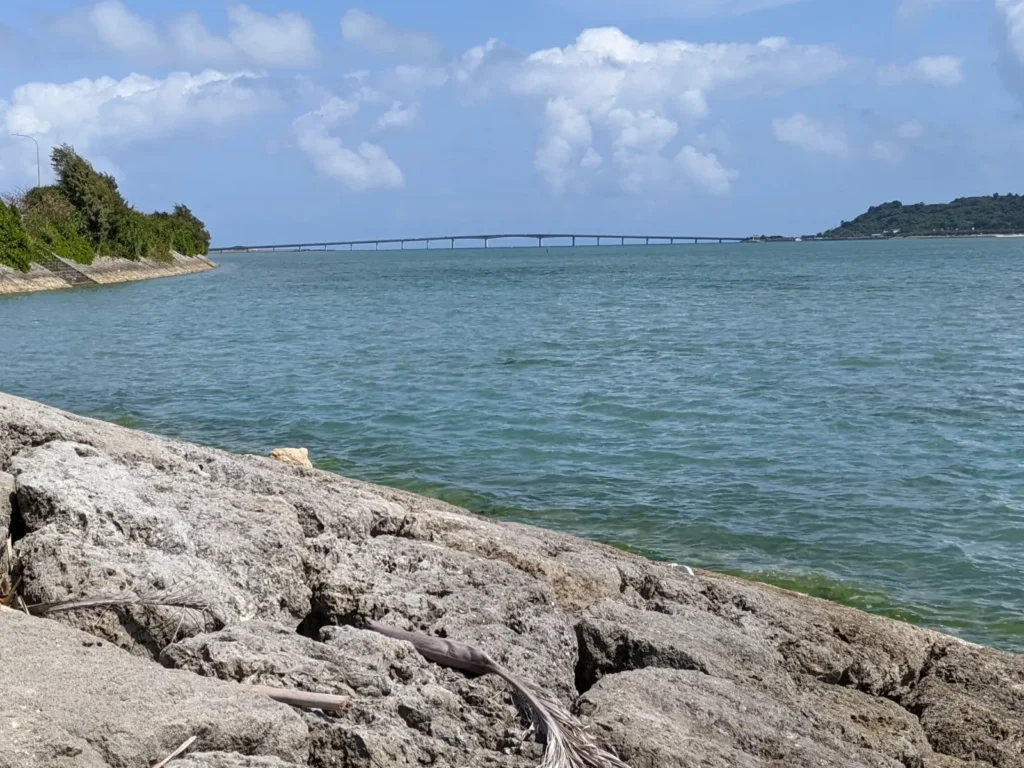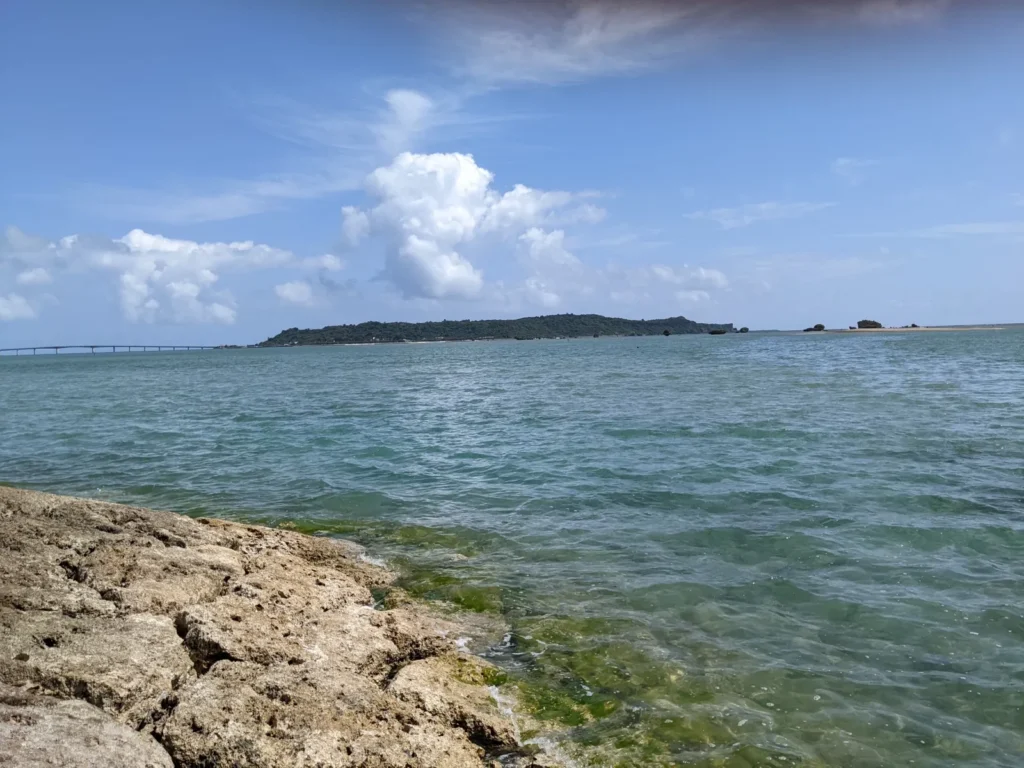 海中道路ビーチには突き出た鼻のような場所があり、🐋クジラのしっぽ🐋と言われています。向こうに見えるのは海中道路がつながっている平安座島です。